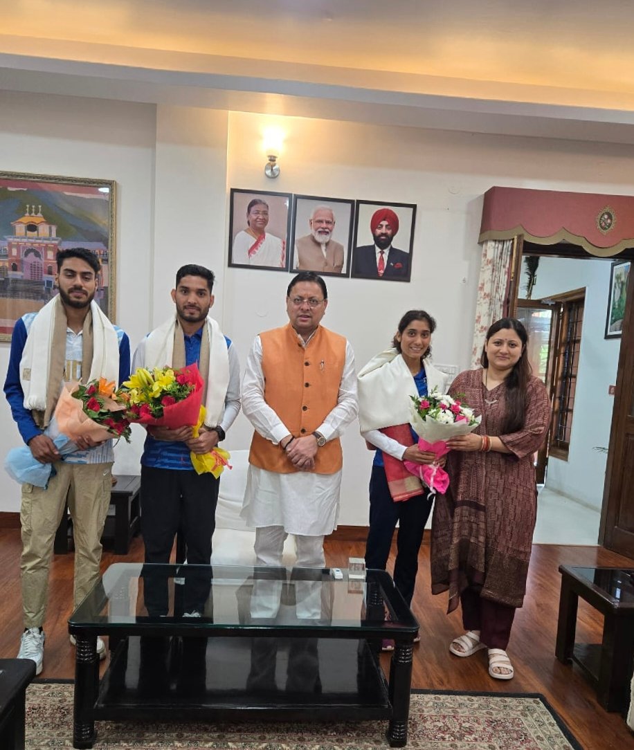 देहरादून। मुख्यमंत्री पुष्कर सिंह धामी से मंगलवार को मुख्यमंत्री आवास में पेरिस ओलिंपिक में प्रतिभाग कर लौटे खिलाड़ियों अंकिता ध्यानी, परमजीत सिंह एवं सूरज पंवार ने भेंट की।