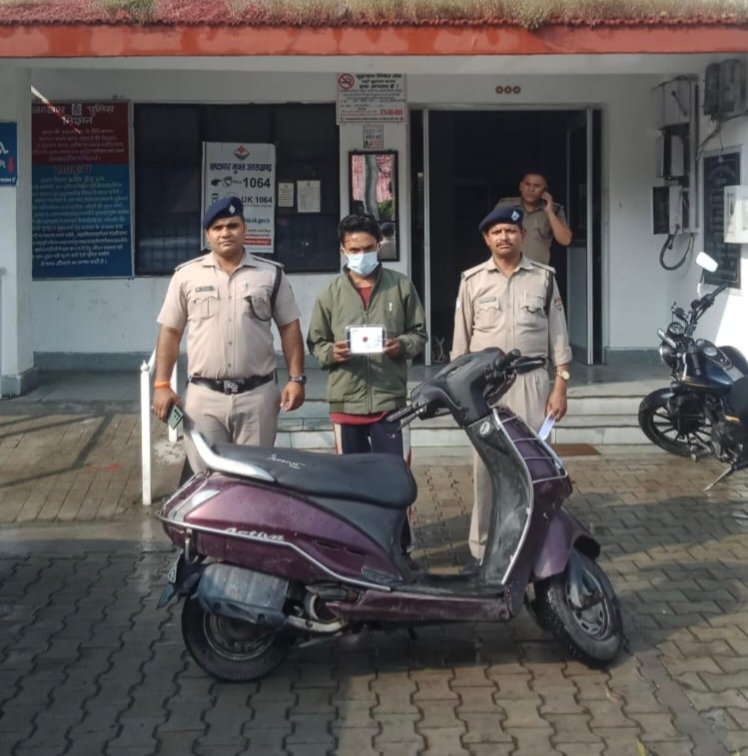 राहुल थापा उर्फ बन्दर पुत्र रमेश थापा निवासी- इन्द्रा कालोनी, चुक्खू मौहल्ला, थाना कोतवाली नगर, जनपद देहरादून, उम्र 28 वर्ष,बरामदगी माल,एक अदद मोबाइल फोन सैमसंग कम्पनी,स्कूटी सं0- UK07AX-2693 परपल रंग (कोतवाली नगर पर पंजीकृत अभियोग से सम्बन्धित)