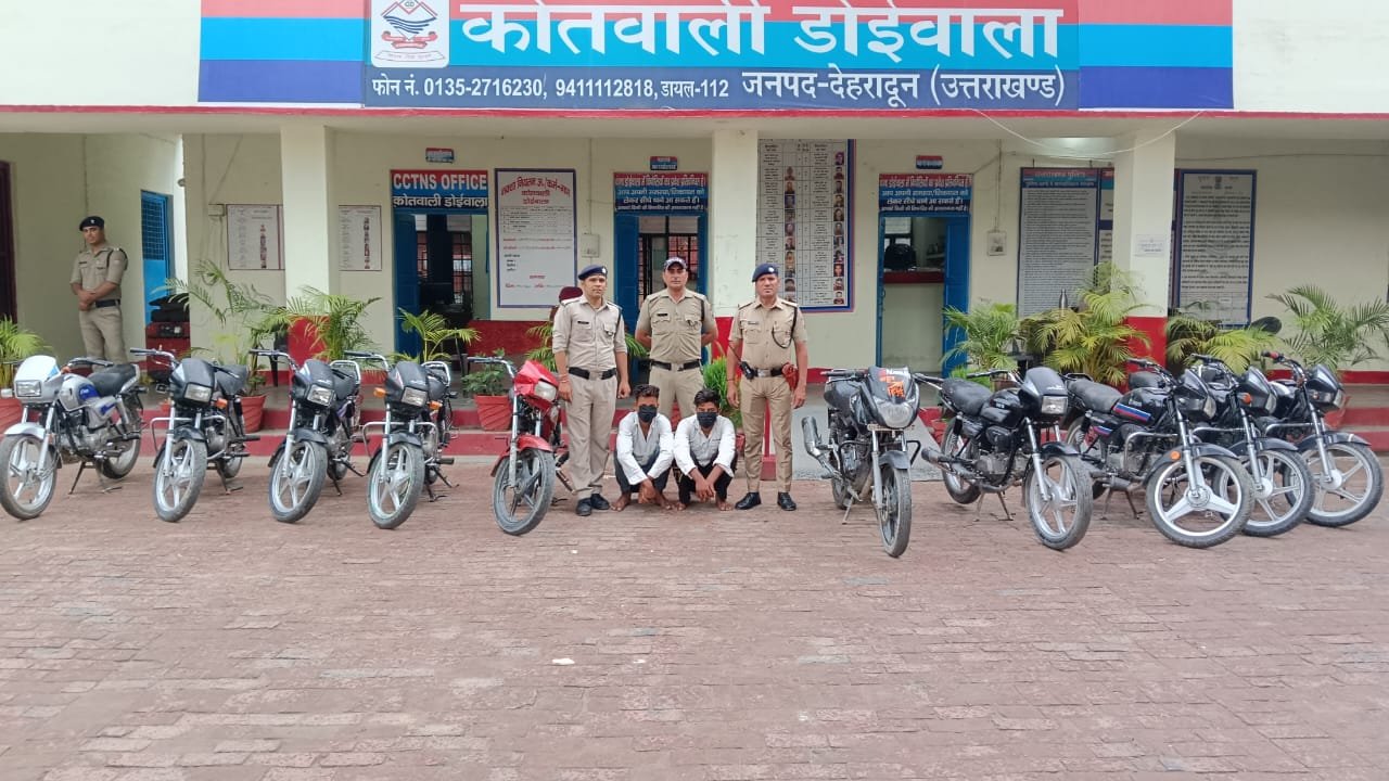 लगातार हुई वाहन चोरी की घटनाओं के दृष्टिगत वरिष्ठ पुलिस अधीक्षक देहरादून द्वारा तत्काल घटनाओं के अनावरण हेतु अलग-अलग पुलिस टीमें गठित कर आवश्यक निर्देश निर्गत किये गये। गठित टीम द्वारा घटना स्थल का निरीक्षण कर आस-पास लगे सीसीटीवी कैमरों की फुटेजो का अवलोकन किया गया, साथ ही सुरागरसी-पतारसी करते हुए स्थानीय मुखबिर तंत्र को भी सक्रिय किया गया। पुलिस टीम द्वारा किये जा रहे लगातार प्रयासों के परिणामस्वरूप थाना डोईवाला पुलिस द्वारा वाहन चैकिंग के दौरान बालकुआंरी चौक, लालतप्पड से मुखबिर की सूचना पर दिनांक 23-06-2024 को 02 अभियुक्तों 01-अभिषेक कुमार पुत्र मगन सिंह तथा 2- रूपेश पुत्र ओमप्रकाश को डोईवाला क्षेत्र से चोरी की गई स्पलेन्डर मो0सा0 संख्या: यू0पी0-20-बीजेड-2570 के साथ गिरफ्तार किया गया। अभियुक्तों से सख्ती से पूछताछ करने पर उनके द्वारा अलग-अलग स्थानों से चोरी की अन्य मोटरसाइकिलो को चोरी करना बताया गया, अभियुक्तों की निशानदेशी पर पुलिस टीम द्वारा लालतप्पड के पास एक बदं पडी फैक्ट्री से अलग- अलग थाना क्षेत्रों अभियुक्तों द्वारा चोरी की गई 09 अन्य मोटर साईकिलो को बरामद किया गया।